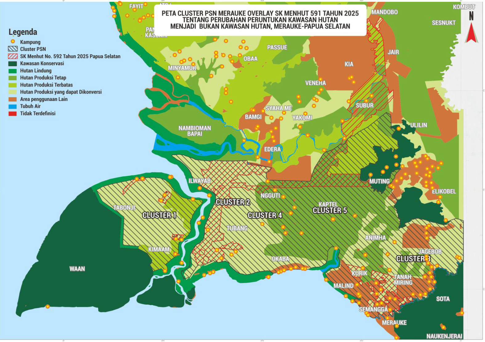 Peta Cluster PSN Merauke overlay SK Menhut 591 Tahun 2025. Sumber: Pusaka Bentala Rakyat.