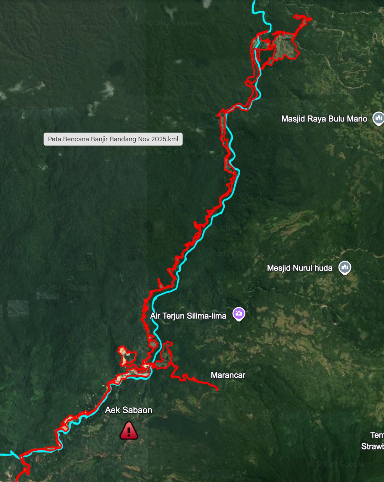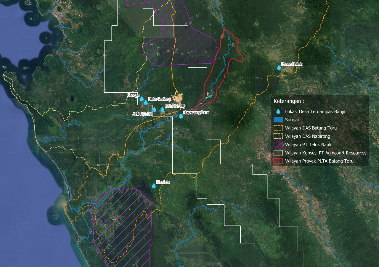 Tumpang susun peta beberapa daerah yang terdampak banjir dengan wilayah konsesi Tambang Emas Martabe. Nampak kedua wilayah ini berdekatan dan berada dalam kawasan dua Daerah Aliran Sungai yang juga berdekatan: DAS Nabirong dan DAS Batang Toru. Data: Satya Bumi