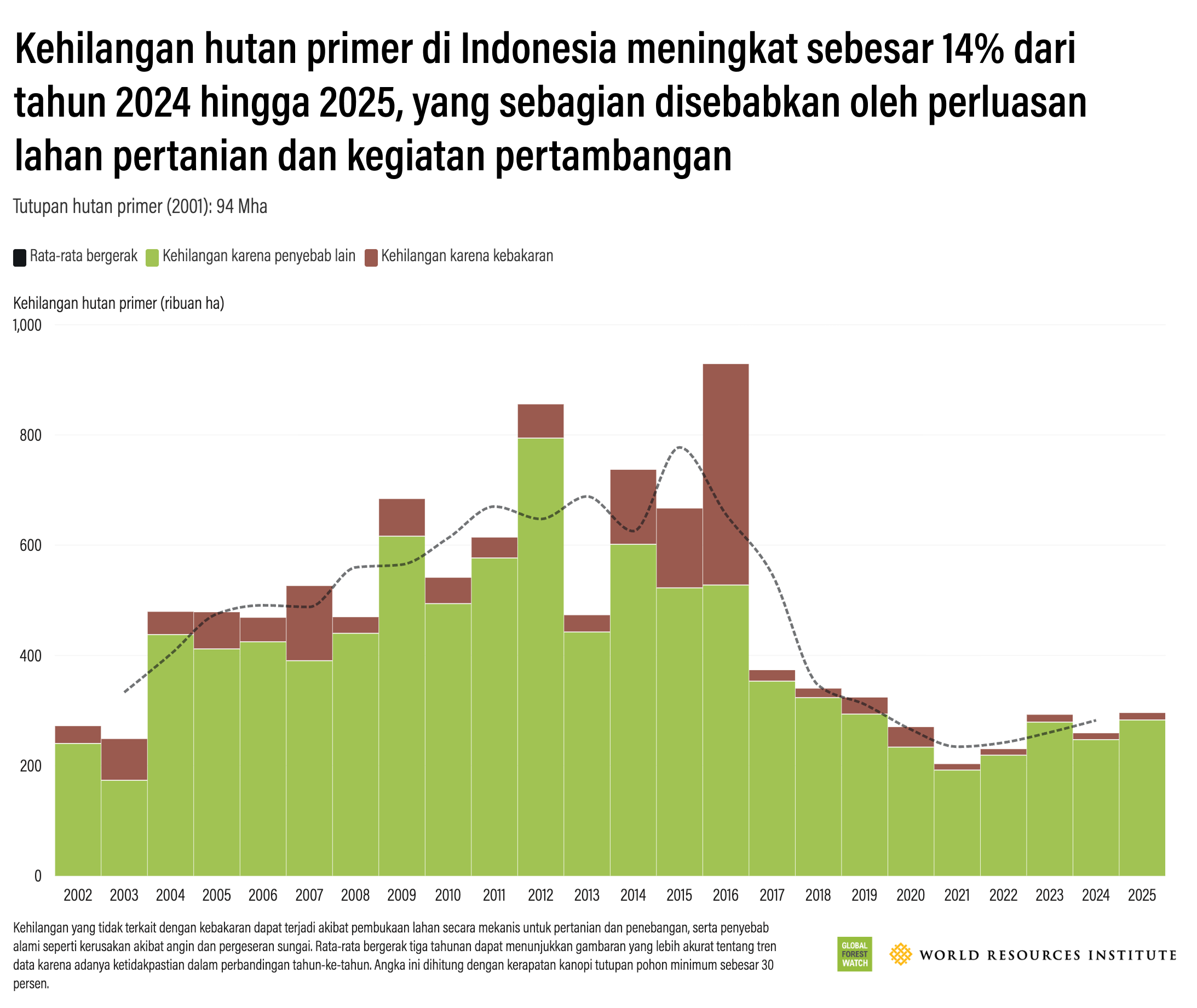 WRI mencatat kehilangan hutan hujan tropis primer di Indonesia mencapai 295.595 ha atau 14,2 persen dibandingkan 2024. Goldman menyebutkan kontribusi atas deforestasi ini di antaranya adalah proyek 2 juta ha food estate di Papua dan pertambangan nikel di Sulawesi.