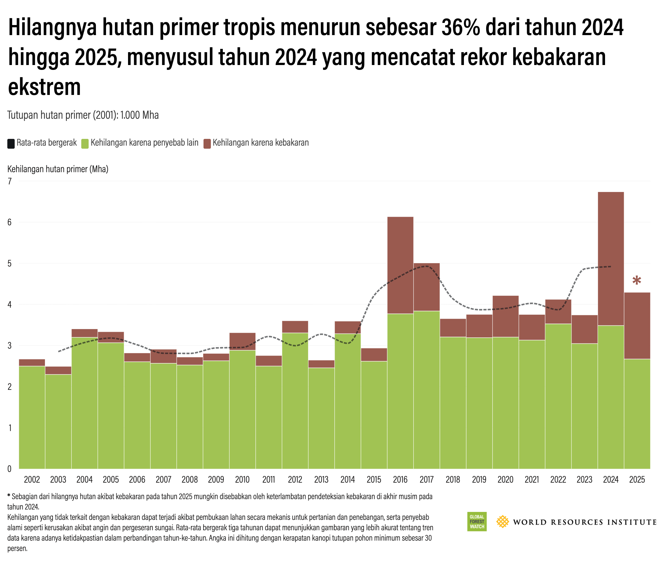 Hilangnya hutan primer tropis menurun sebesar 36% dari tahun 2024 hingga 2025, menyusul tahun 2024 yang mencatat rekor kebakaran ekstrem. Data: WRI