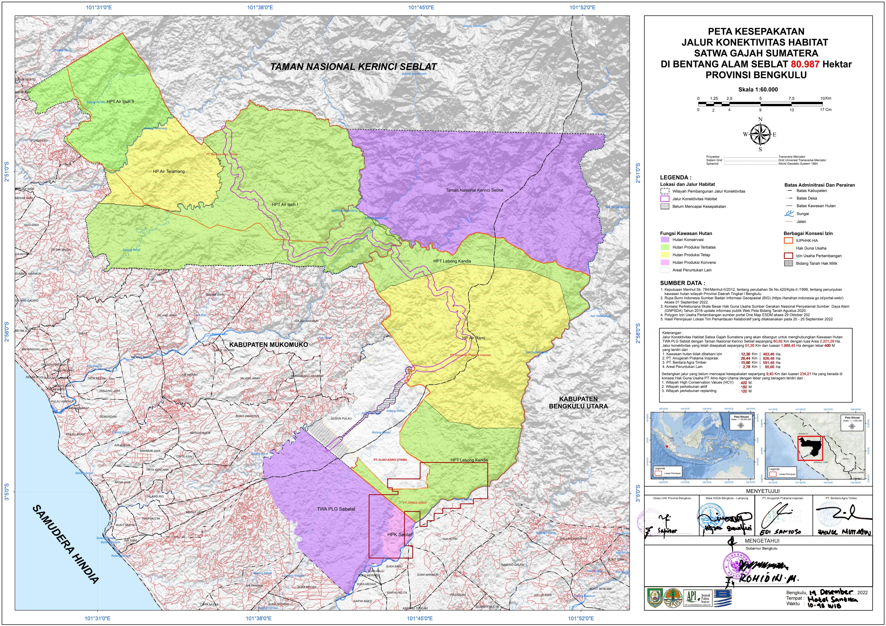 Supintri menjelaskan, pada Desember 2022, Dinas Lingkungan Hidup dan Kehutanan Bengkulu, Balai Konservasi Sumber Daya Alam (BKSDA) Bengkulu-Lampung, PT Anugerah Pratama Inspirasi dan PT Bentara Agra Timber, pernah menandatangani Peta Kesepakatan Jalur Konektivitas Habitat Gajah Sumatera Bentang Alam Seblat Seluas 80.987 Hektare.