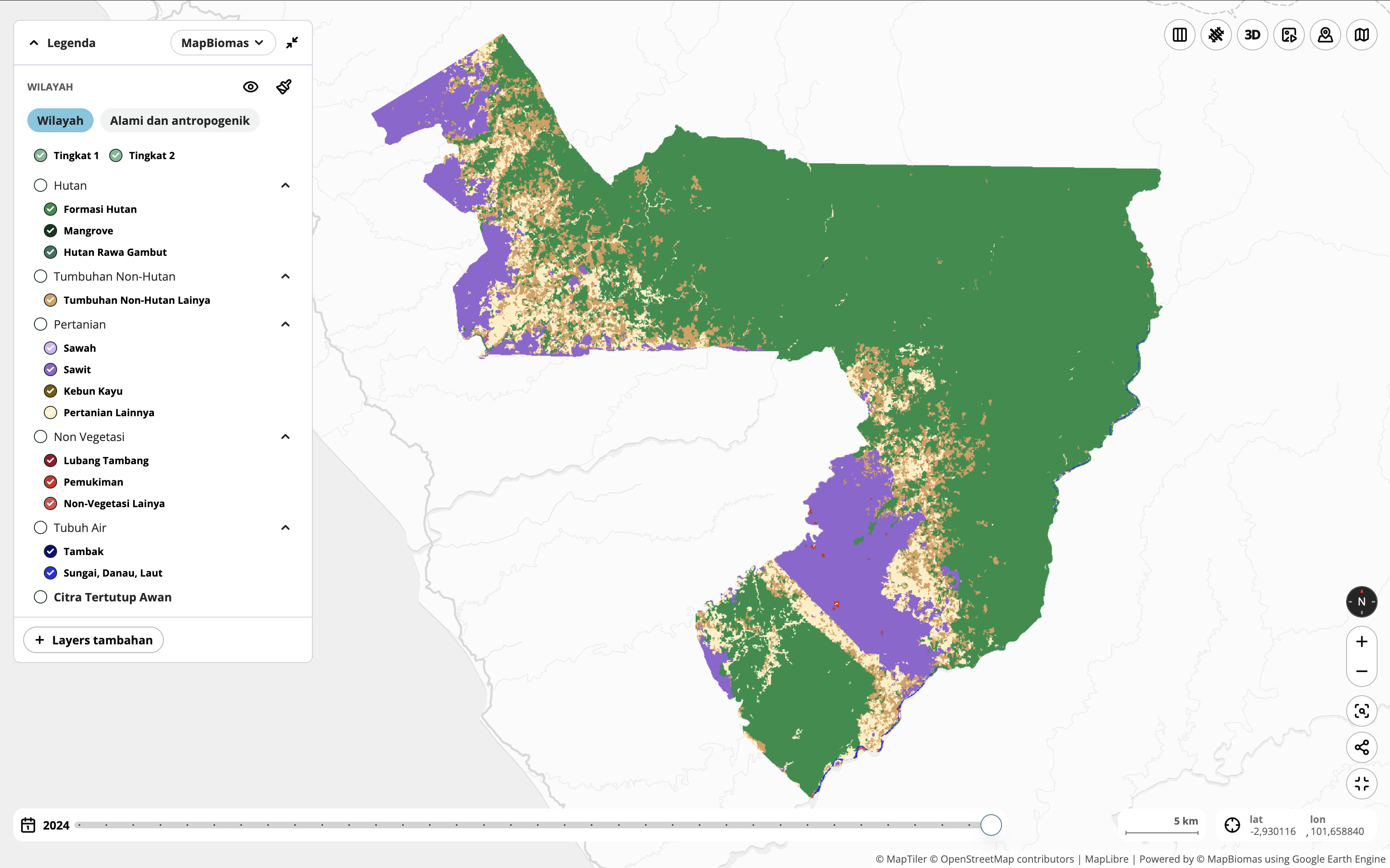 Peta kondisi tutupan lahan di habitat gajah sumatera di bentang alam Seblat, Bengkulu, pada 2024. Sumber: Mapbiomas Indonesia.