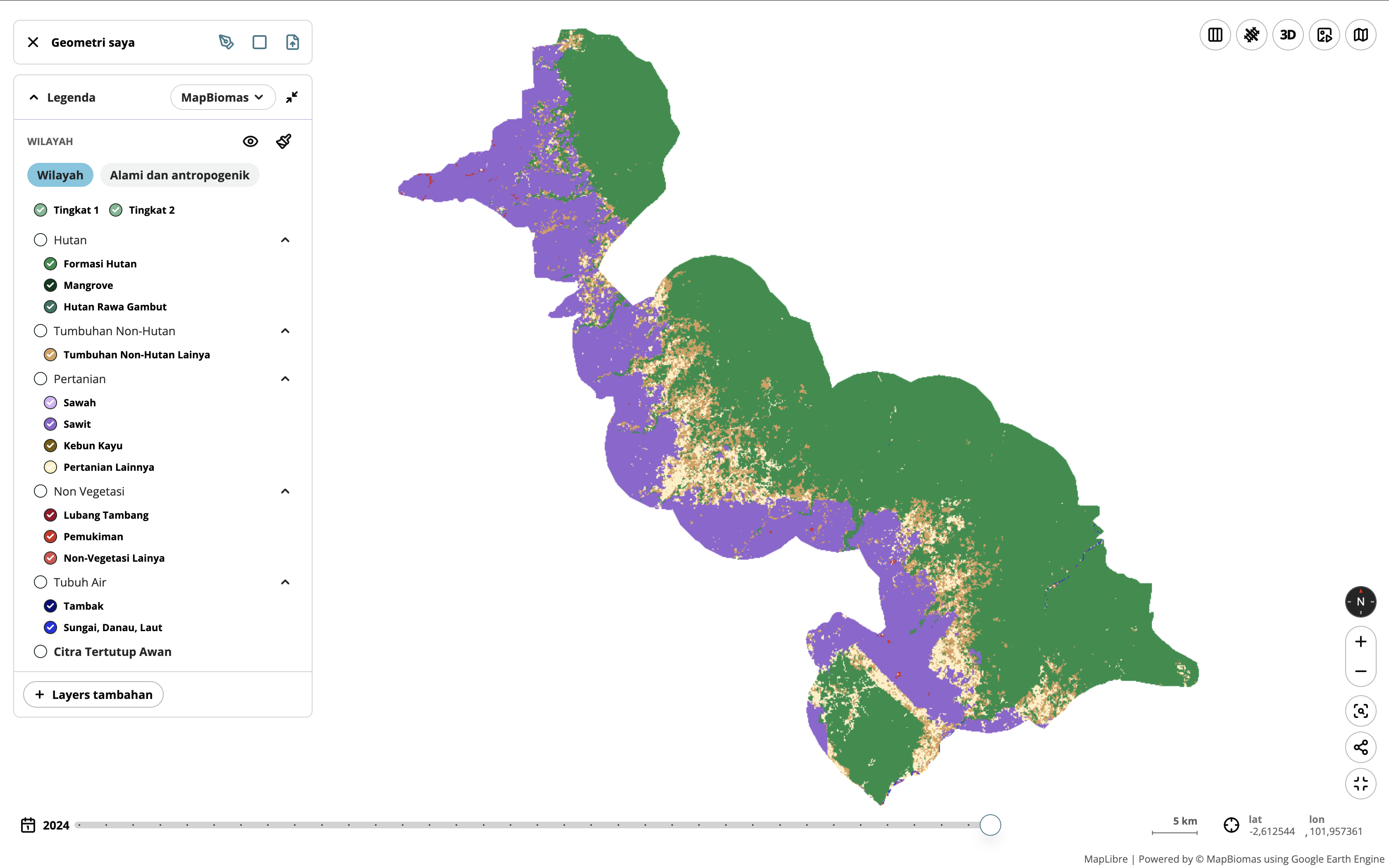 Peta kondisi tutupan lahan di kantong habitat gajah sumatera di bentang alam Seblat. Sumber: Mapbiomas Indonesia.
