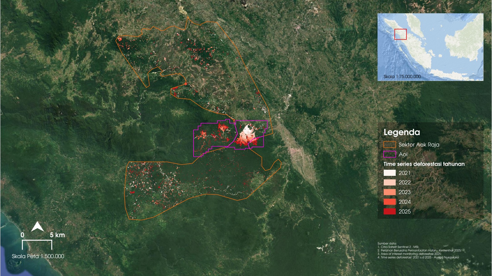Peta sebaran deforesitasi di dalam dan di sekitar konsesi PT TPL di Sektor Aek Raja. Sumber: Auriga Nusantara.