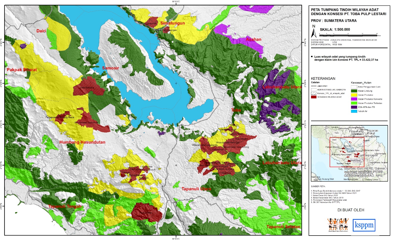 Peta sebaran wilayah adat dan konsesi PT TPL. Sumber: AMAN Tano Batak dan KSPPM.